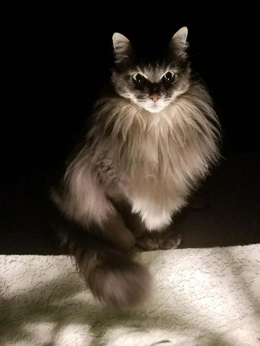 We adopted Ricky from Maine Coon Rescue the end of 2011, a few months before his 3rd birthday. His personality is one of a kind. He loves our screened in enclosure, especially chasing lizards. Ricky's favorite place is the top of the refrigerator where he can be King of the House. This picture was taken of him sitting on top of the spa. He is being Bat Cat!