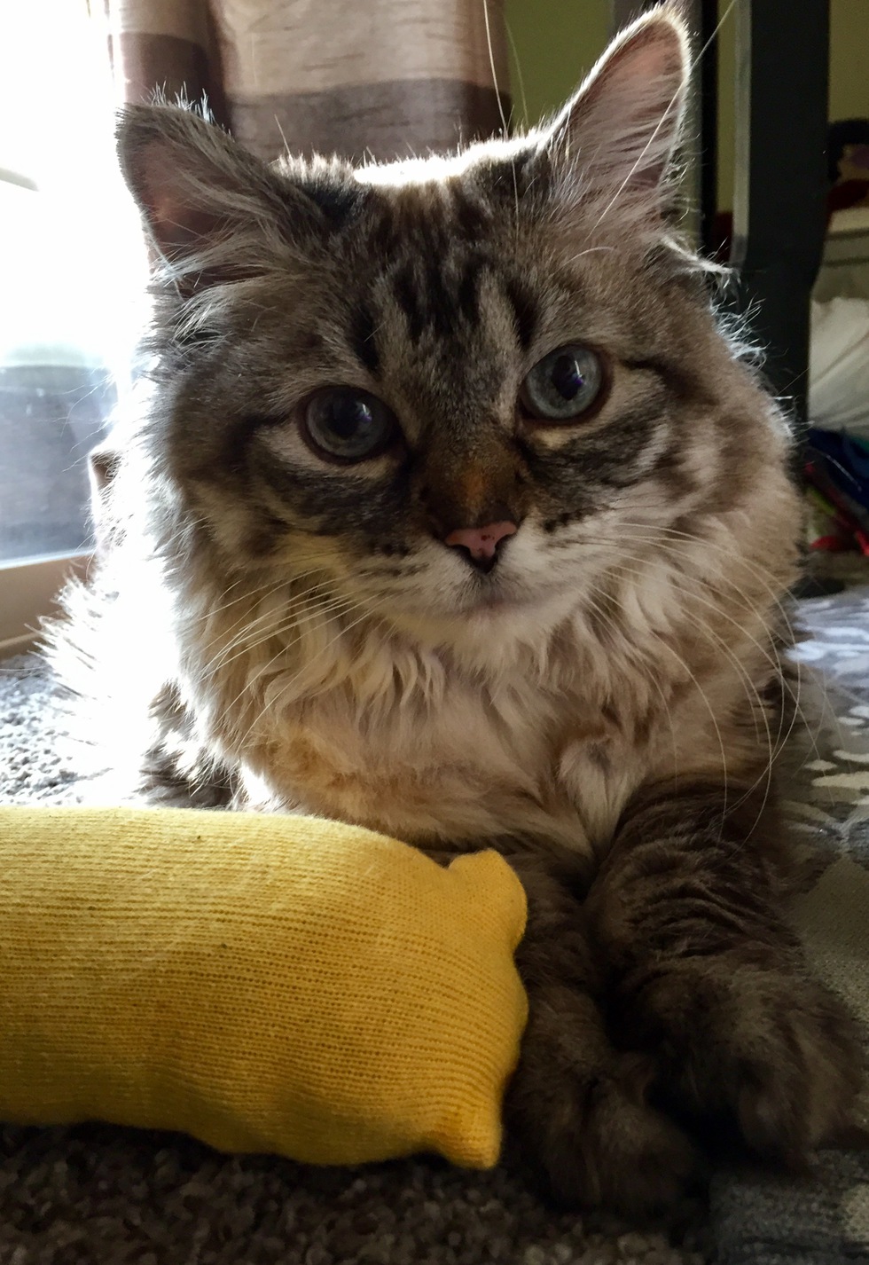 Her life buddy, Nora, an adopted dsh from the DDFL, helped mother her. Until overnight at a year old, Yosh doubled in size, started talking and showed the amazing intelligence and affection of a MC. She was love with a side of spunk and gave respect to her buddy by bowing when Nora came near. Yoshi’s size and 2nd to own me showed the alpha in Nora and it was always respected.