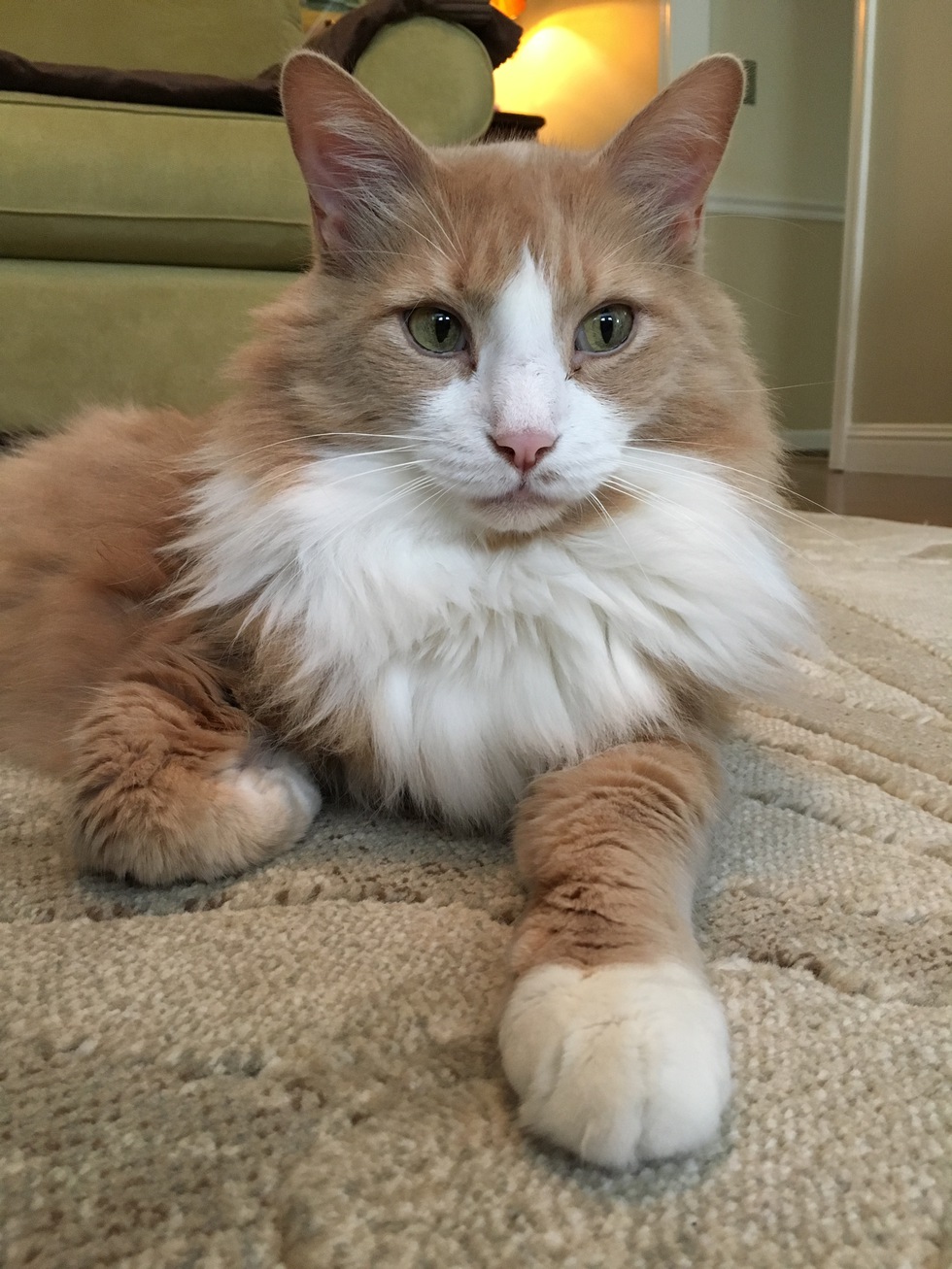 Leonard was about 5 years old when we got him from the Maine Coon rescue center. He’s been with us for almost 4 years now. He has adapted really well and has turned out to be much more than we had hoped for.