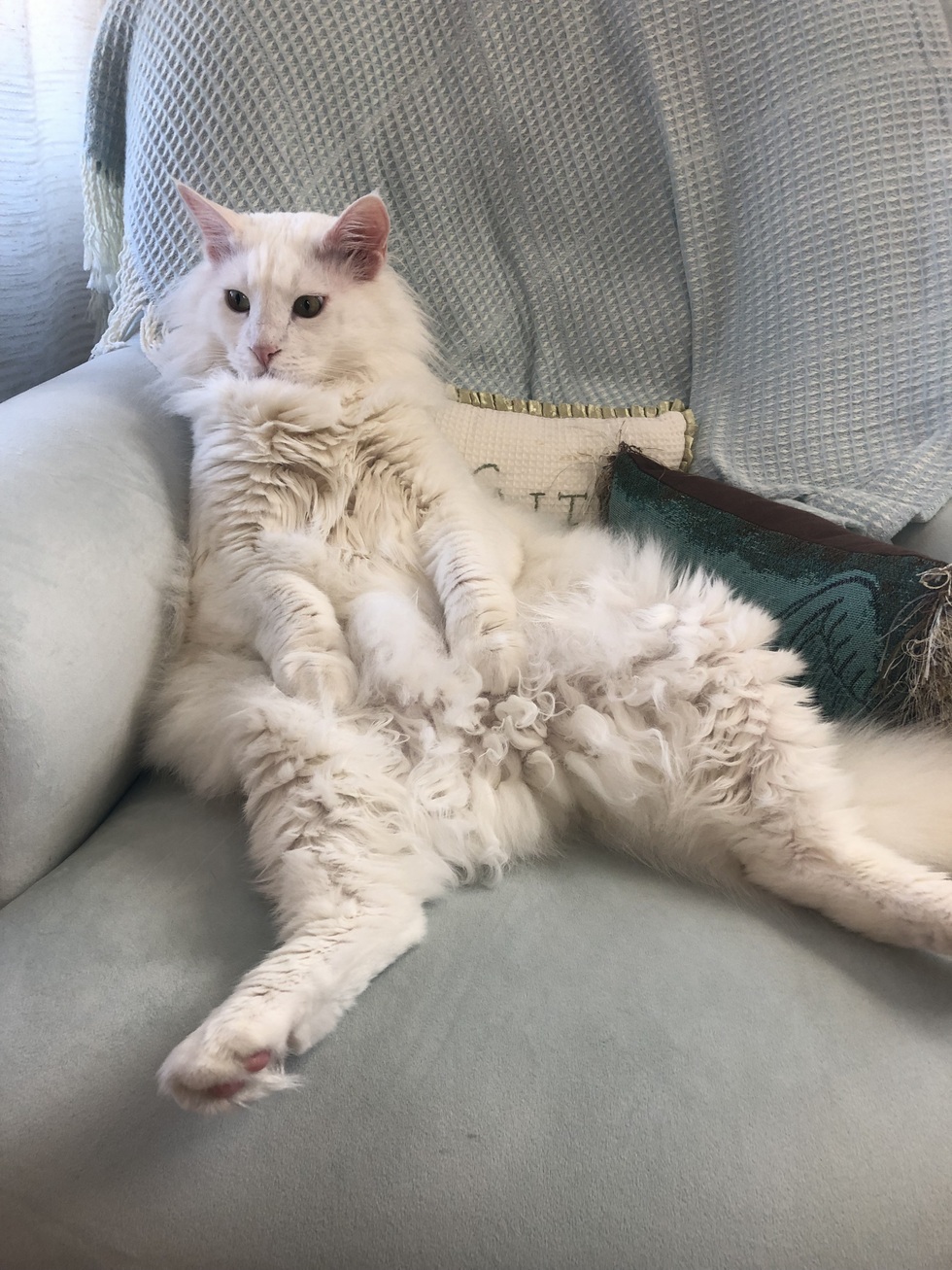 Fenris is a Turkish Angora rescued from Turkey. He was bought as a childs temporary pet and when summer was over he was rescued by Avallalar and flown to the US. He is 6 yrs old now, residing in N.C. after living in N.Y. He is definitely part dog, part human and only a little bit feline. He can be found on top of a cabinet, on his hammock or reclining like a human on a couch.