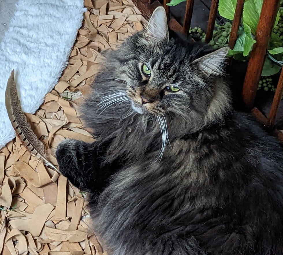 After I recovered from the unexpected loss of Freddy, my first MCR adoption, I told MCR I wanted a cat that looked like he had just walked out of the wild. And then, out walked Simon into my life with a stern “I mean business” expression. Although he has an ever-gruff look…. don’t ask him to say “cheese” for the camera... he has a sweet soul and gentle personality. He came from a household that suppressed his personality but in my quiet home, I found that he bloomed and blossomed more every day. He loves the Christmas tree and steals a feather from the branches every day, as did Freddy. Mommy lets him play with it awhile but then retrieves it, smooths it out and puts it back…. all to be repeated the next day, and the next and the next. One of his favorite pastimes is chasing the auto lights that shine in…of course, that is a never-ending challenge as the elusive light will never be caught. One source of joy for him ended in the demise of a lone firefly that ventured in. He didn’t quit chasing it until…yes, he got it!