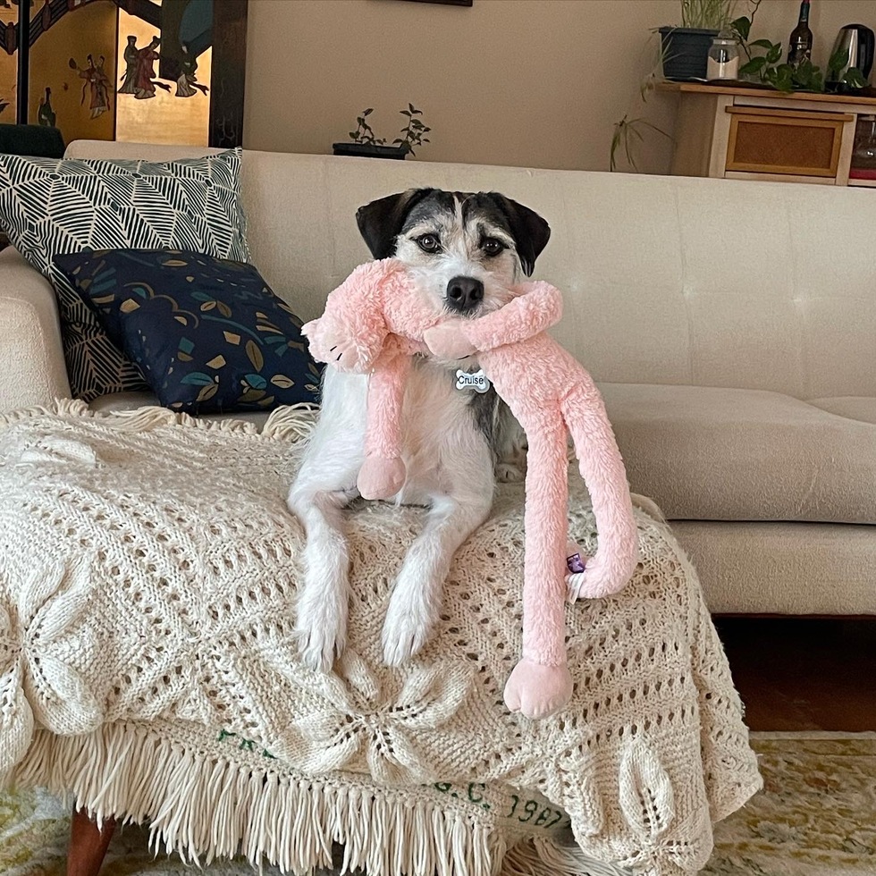 Cruise joined our family in May 2021. Since then, he has brought us joy every day with his good looks and loving personality. He is pictured with one of his favorite toys in one of his favorite spots.