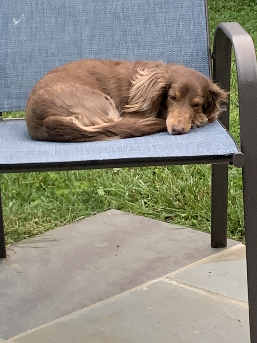 Hershee came to us about 5 years ago via the MAMAS volunteer carpool in Alexandria. She was 5 and had never lived indoors. Now she has a house with 4 beds to sleep in, a fenced in backyard to explore in, and her own chair around the fire pit. She’s been dubbed the Farrah Fawcett of dogs by our friends. At 11 years old now, she loves to nap wherever she can and soak in sun puddles on her front and back porches!