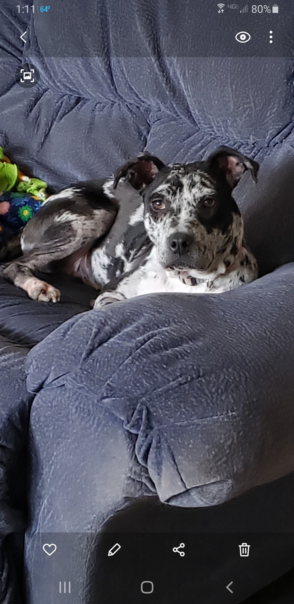 She was picked up as a stray in South Carolina had very bad mange hardly any fur left she is a total sweetheart can't imagine life without her!!