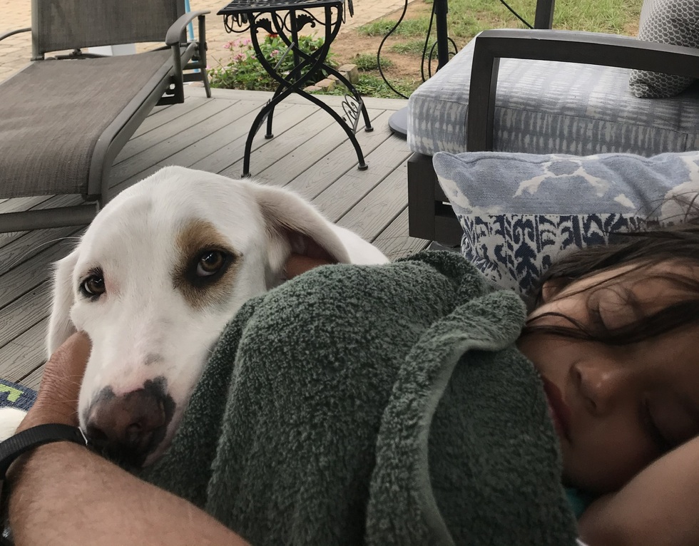 We adopted Charlie aka Handsome Hoss along with his sister Lucy (aka Shining Shiloh) October 2019. He was initially shy and timid and has become a silly, lovable, goofy family member. Always ready for snuggling , running around or whatever the situation calls for! Charlie weighs 90 lbs. but he is sweet and gentle in spite of his large size. This picture is of Charlie showing some love to our sleeping granddaughter.
