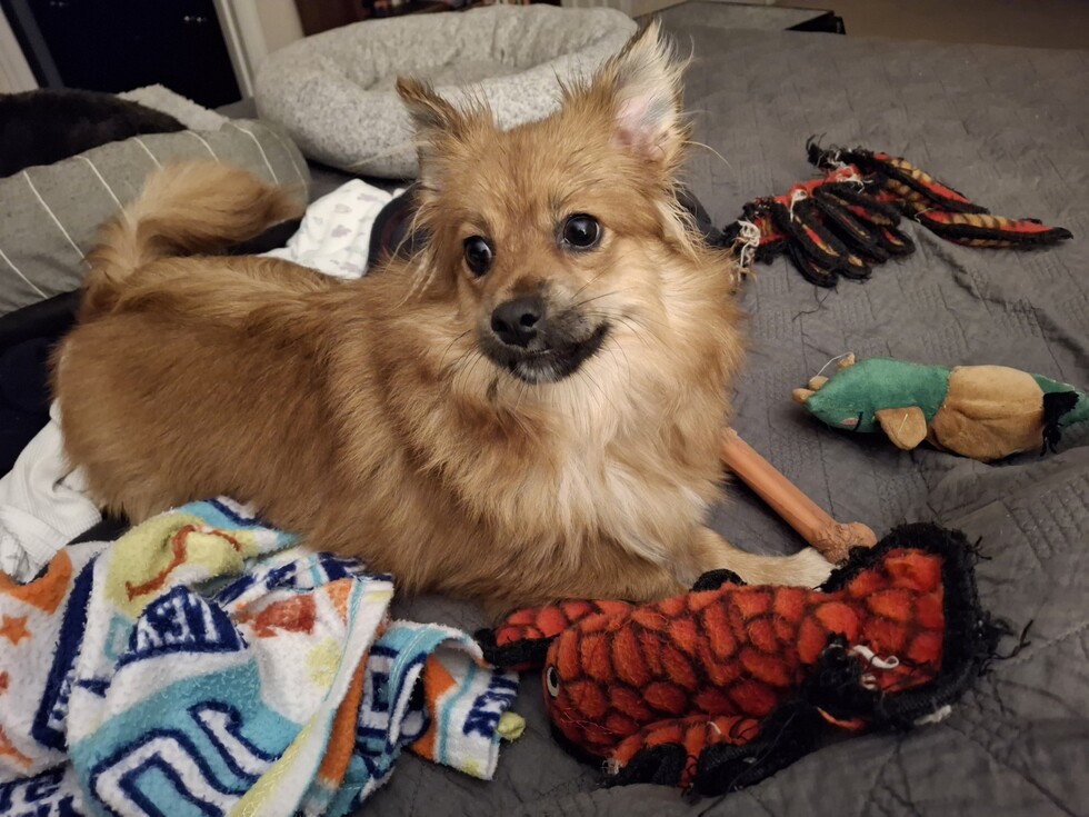 I adopted Sansa (nee, Baebae) in July to join my pack (with my 12 yea old dachshund-yorkie-chihuahua mix Sammy). She still has tons of puppy energy and loves chewing (toys, fingers, toes, etc.). So she always had a ton of toys surrounding her - as in this picture on top of the bed. She is a total sweetie!