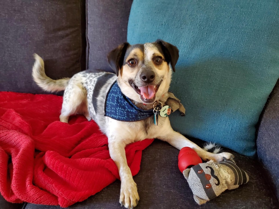 Banjo really is the bestest boy. He loves his musician humans (they were obviously smitten with him and his name immediately!) and his new home in Baltimore. He was an anxious boy at first but now loves making new friends and is getting more comfortable every day. His favorite pass times are eating peanut butter, shoving toys in your face, and walking, but only in the direction he chooses!