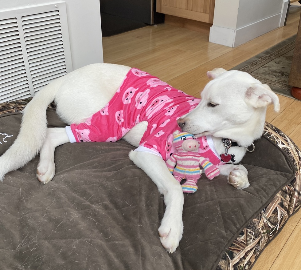 When Ripley (fka Beau) came to us as a foster, we both had no idea he was finding his forever. He showed up and he had one possession only - this little pink piggy. He still loves it dearly. PJs had to match for this contest!!! Thank you to Maryβs Dogs and Amy Dean for our beautiful, handsome boy! πππ