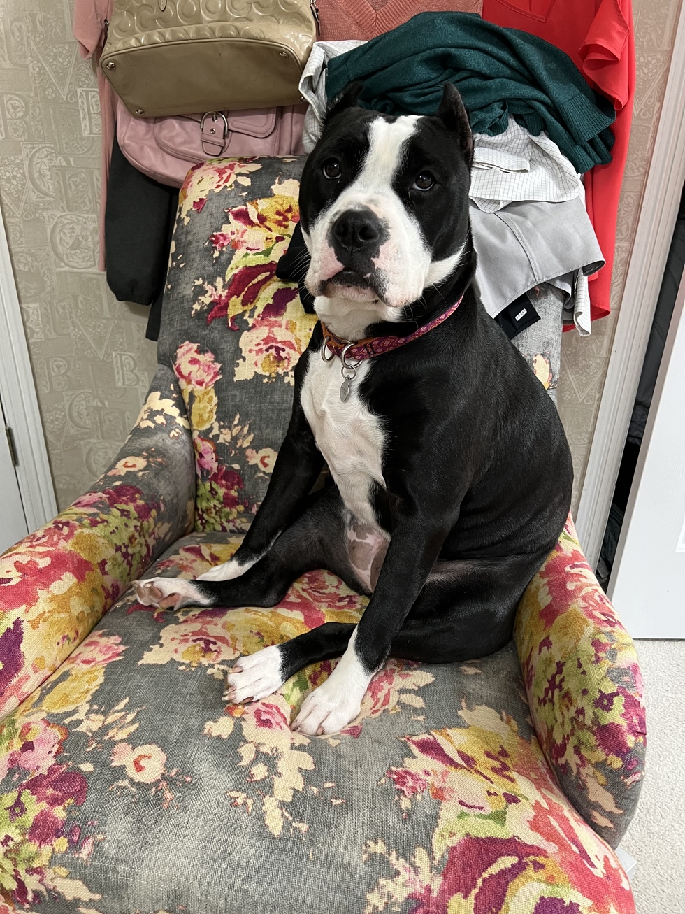 Tootsie came from a shelter in Houston on 2/11/2021. I was only her transport. However, after a horrible battle for her life and nursing her back to health along with one adoption that didn’t work out….we accidentally foster failed. Now she’s our forever nut dog. Who can resist her zest for life? 😊 it’s written all over that resting pit face! #souldog