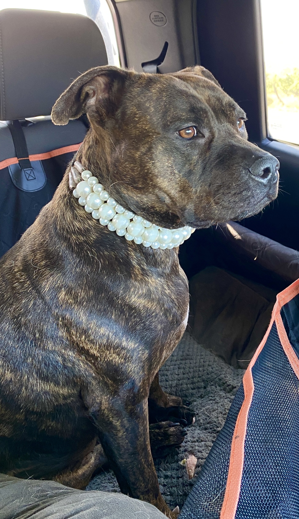 Hi, I’m Molly! I am a spunky 3 year old girl who loves to play, go on walks with my big brother Maxx, snuggle, and chew on bones. Mom and Dad say that I’m a diva. Is it wrong for a girl to know what she wants and go after it? I’m definitely spoiled rotten but I’m told that I’m worth it! I was rescued by the pittie people in fall 2018 and adopted the day after Christmas. I’m such a lucky girl! Don’t you just love my pearl necklace and brindle color? I would love to be the merch mascot for the group that found my forever home. What do ya say? Please vote for me! Thanks! (🐾❤️🐾❤️)