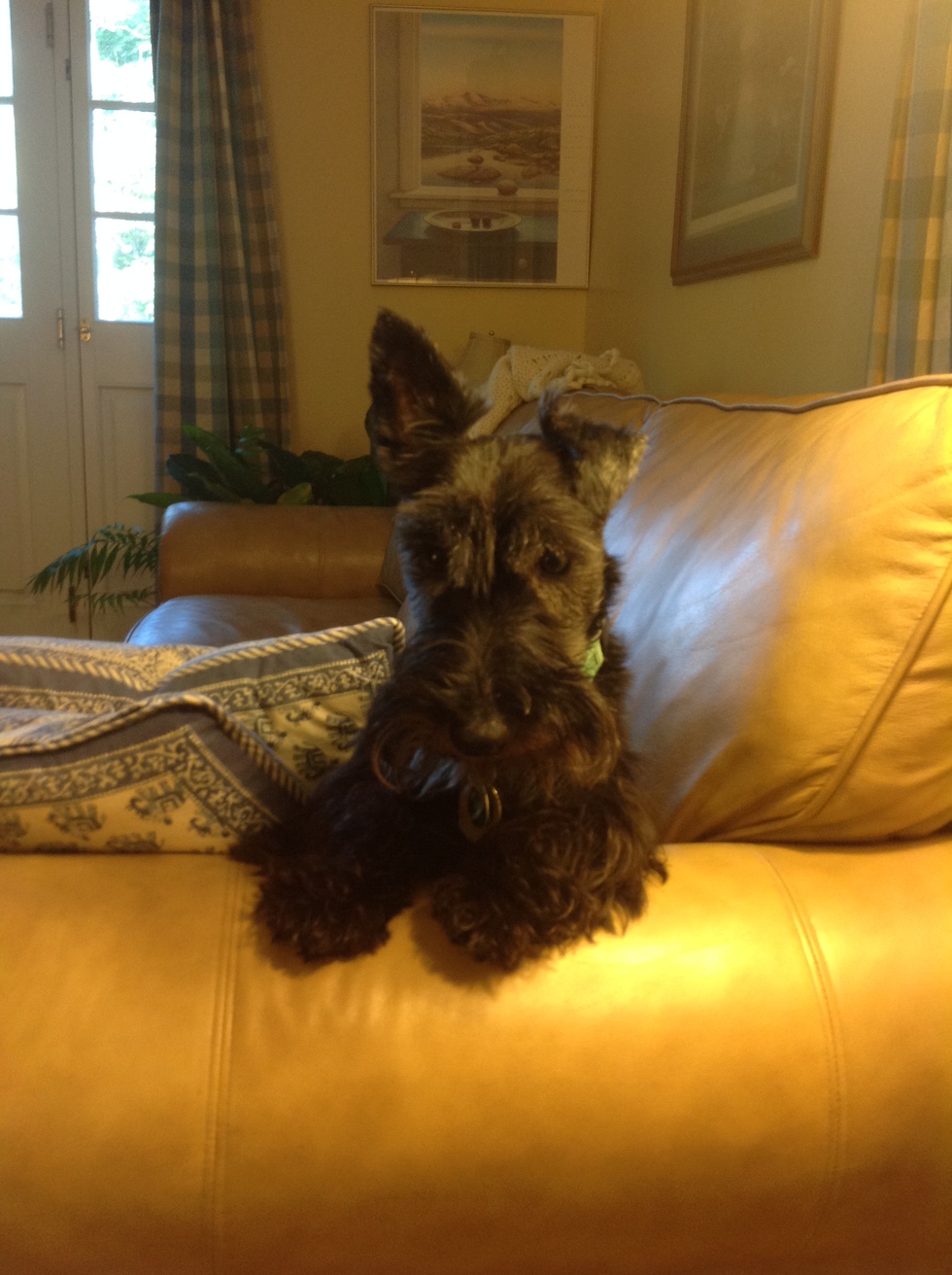 We adopted Rocky from Master three years ago. When we woke the first morning after bringing him home, he was walking around the house squeaking a toy. He announced his presence this way for the first week. He is a dear, although rather lazy. He is now very considerate of our Scottie girl, Penny Mae, who is ill. He waits for her on our walks and  will not come inside until she does.