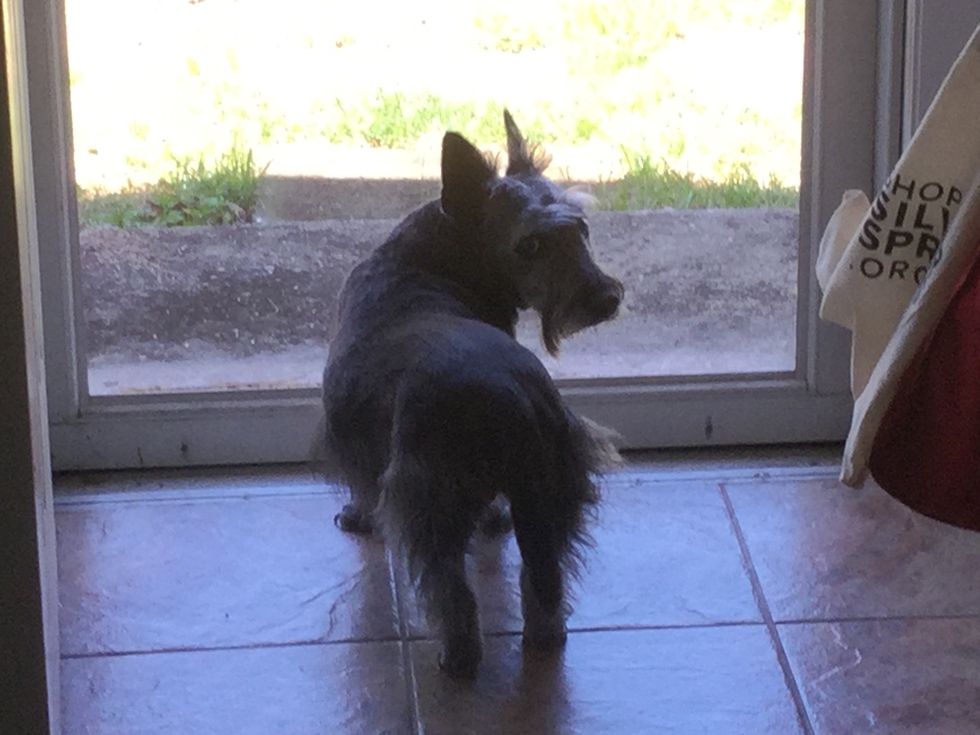 Saydie was a rescue in 2004 and she has been our sweet, toy killer since!! She loves a good nap and destuffing her toys of fluff and squeakers in a ferocious manner! She has ruled the house since she came into our lives and we wouldn't have it any other way!!  Here she is at our front door saying "Who me? Not now - I'm busy looking for rabbits!"