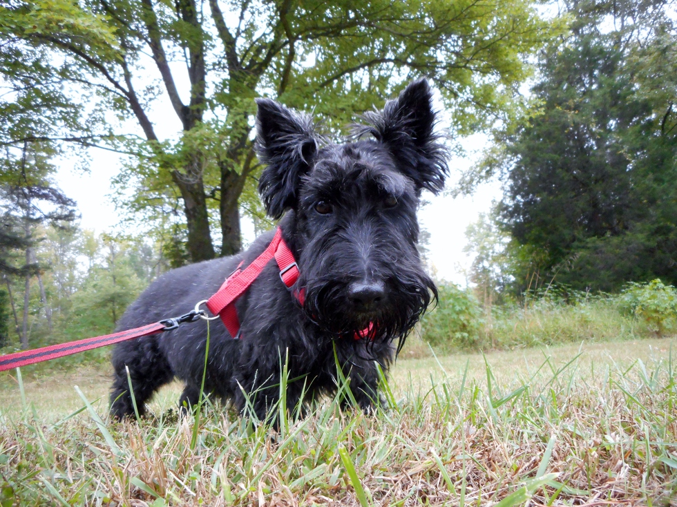 Magil is a 10-year old female and has been with us for nine of those years. She is the most energetic of the three terriers (two Scotties and one Westie) we have had. She absolutely loves to play and she plays hard. She has a 12-inch Jolly Egg toy that is about a third of her size that she pushes all over the backyard and a smaller version she bats around the house. Magil does her best to ensure that the neighborhood squirrels and rabbits get lots of exercise. She also enjoys helping with yardwork, especially pulling up roots. After a hard day of "work" she is happy to retire to what used to be my recliner. In this photo, she is in the middle of a three and a half mile hike through Chancellorsville Battlefield, one of four nearby battlefields she knows very well.