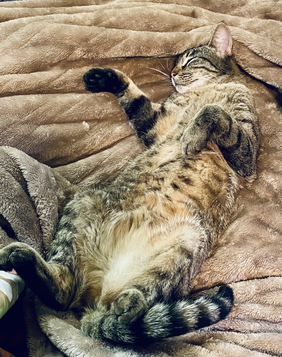 Polly was adopted from the Mendocino Coast Humane Society in 2024 and has been living the spoiled life ever since. She enjoys chasing around her adopted kitty sisters and yelling at her mom for snuggles.
