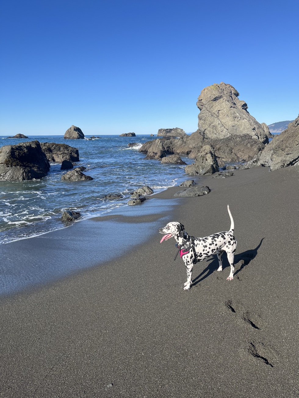 Estella came to live with her spotted brother Eli, another rescue about a year and a half ago. She was given up by her previous family for unknown reasons. She is all puppy! Playful, active and always in to mischief! She looks like a dalmatian but acts like a German shorthair pointer! She enjoys her home, beach and yard time in the coastal village of Westport.