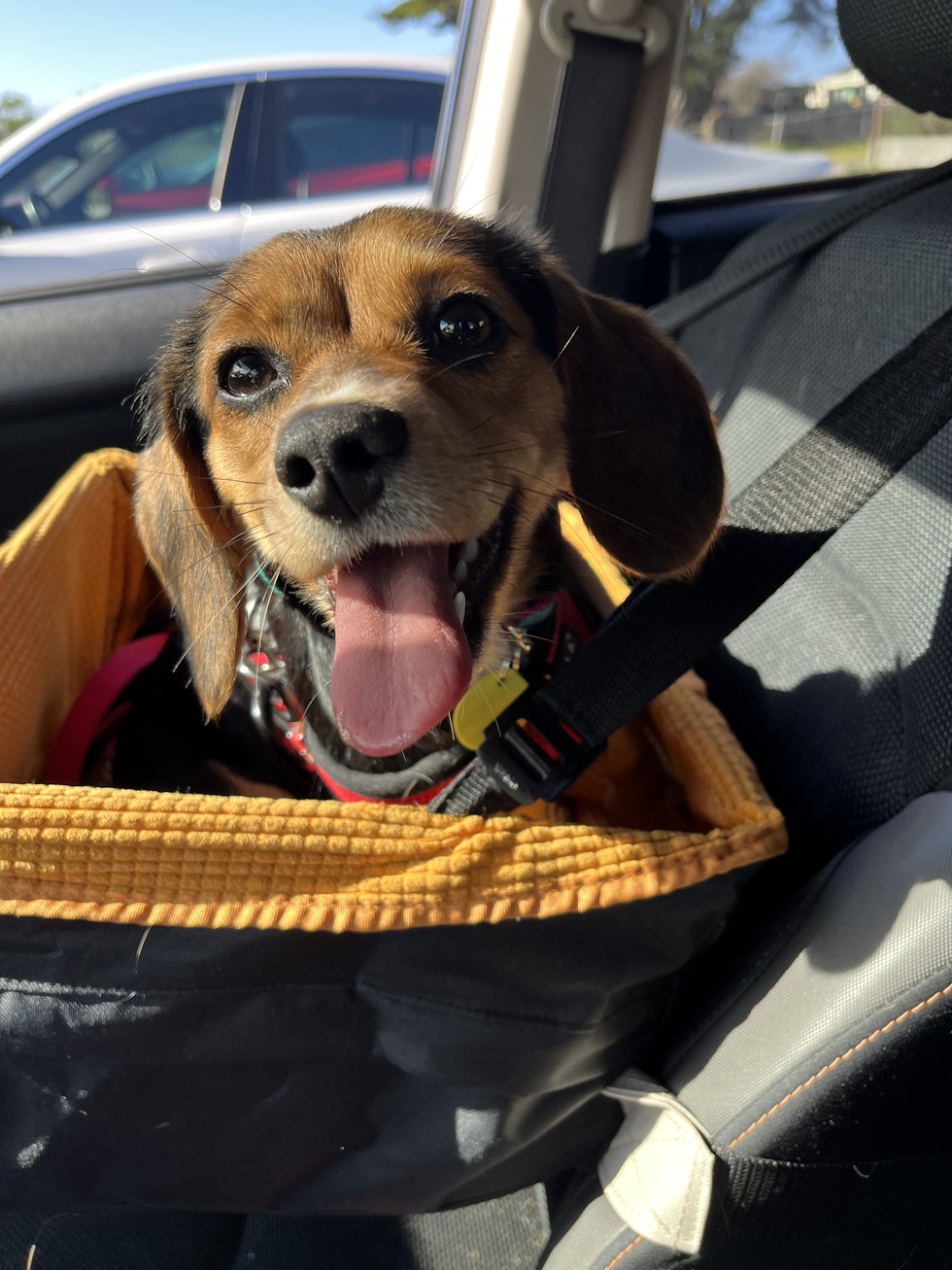 Maple is from a kill shelter in Oakland. When I first got her, she was scared and did not trust anyone. She couldn’t walk down the street. Now she is a cuddly, loving, spunky companion. She loves walks at the Botanical Gardens and trips to the beach. I couldn’t imagine life without her. She brightens my days more than I could ever express. I love her so much!