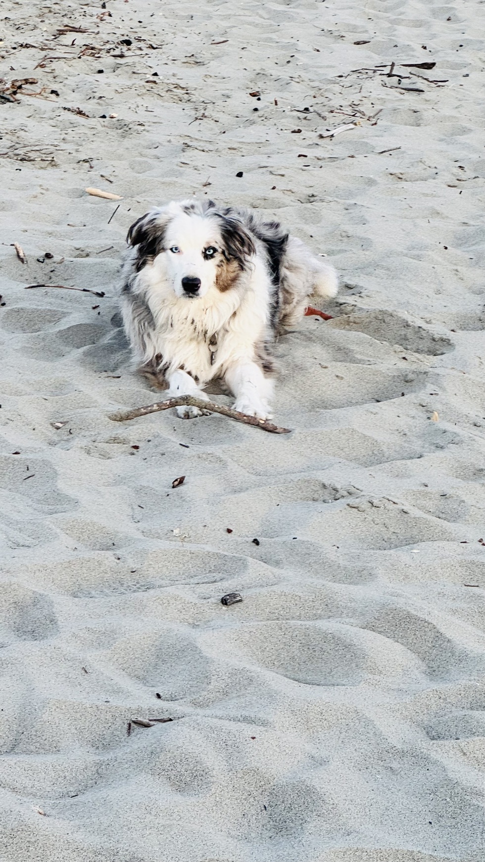 Josie is half Aussie half border collie looking just like her Blue Merle Mama. She just turned 3 and loves chasing the ball & catching frisbees. She had a gentle soul & loves her grand-human toddler. She was born in Aug of 2022 in San Diego, CA and loves her new home here in Fort Bragg. She loved playing in the sand at the beaches here!