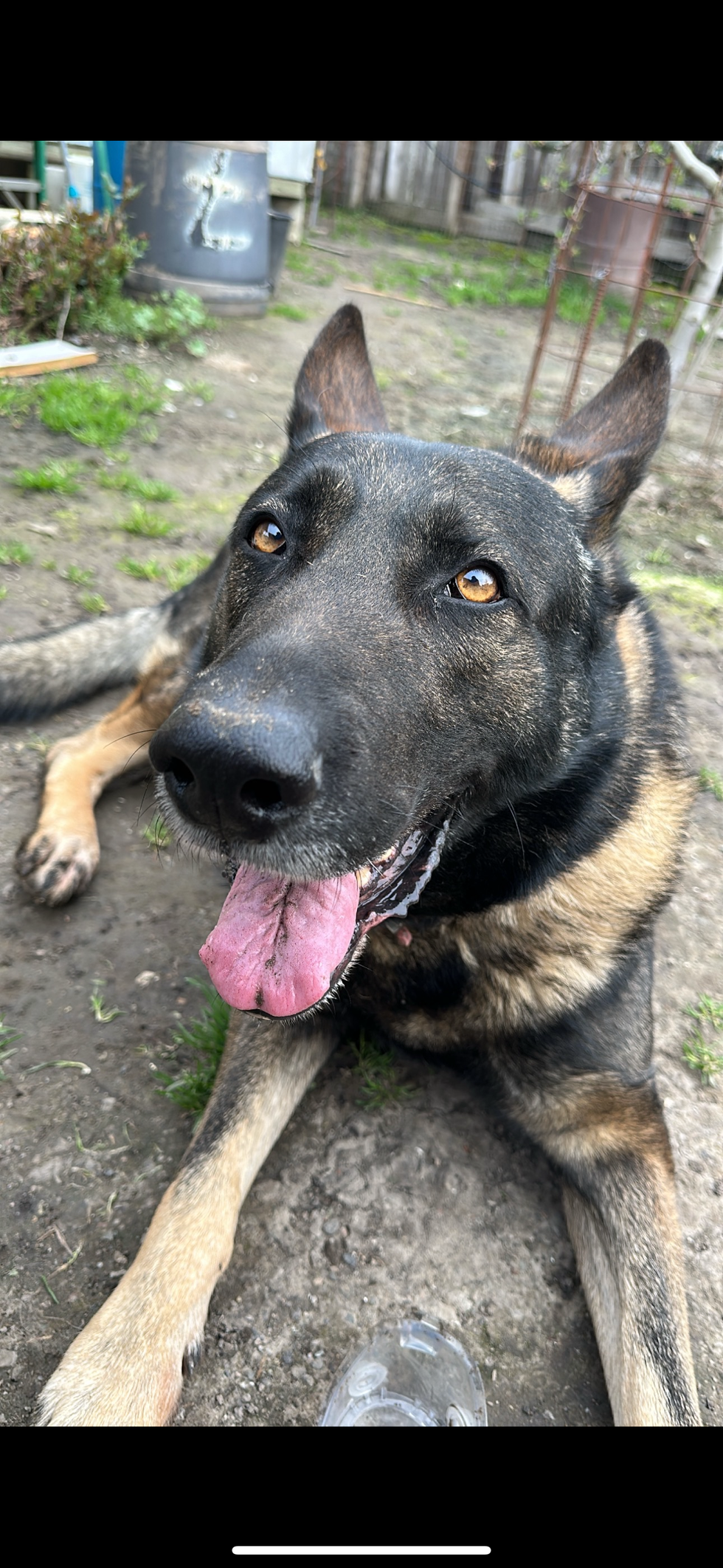 This is Oso a shy, funny, loyal German Shepherd. He understands Spanish and loves chicken. The day we adopted him he hid under our shed for hours. We were able to get him out with a piece of chicken.  In the mornings he likes to go outside and do his sweep around the house. He is scared of other dogs and likes to hide behind mom he is not aware of his size. But mom will always protect him. He’s a big baby he loves massages and his belly rubbed. He loves to go on walks and smell all the flowers on his walk.