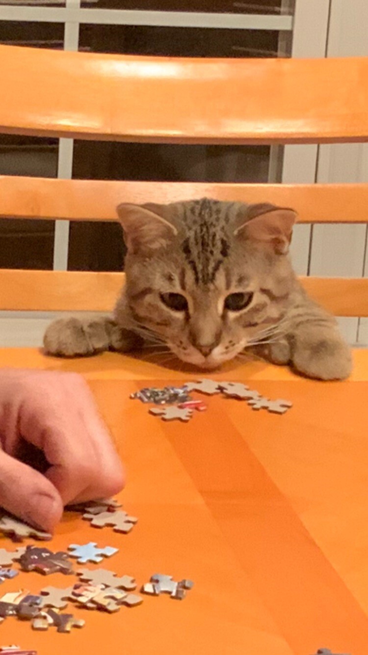 Story or BioFonzie is a polydactyl... also known as a 'Hemmingway cat' because Ernest Hemmingway had polydactyl cats. He has an extra digit on his paws that look like thumbs. Fonzie uses his paws just like a human to grab onto things. Our family loves to watch re-runs of Happy Days on Me TV, so it was only appropriate to name him Fonzie and refer to him as "The Fonz". AAAAAAY! He stands on his hind legs and begs for treats too - it's so irresistibly cute. In this picture he is helping us put together a puzzle... but his way of helping is stealing the pieces and chewing on them!