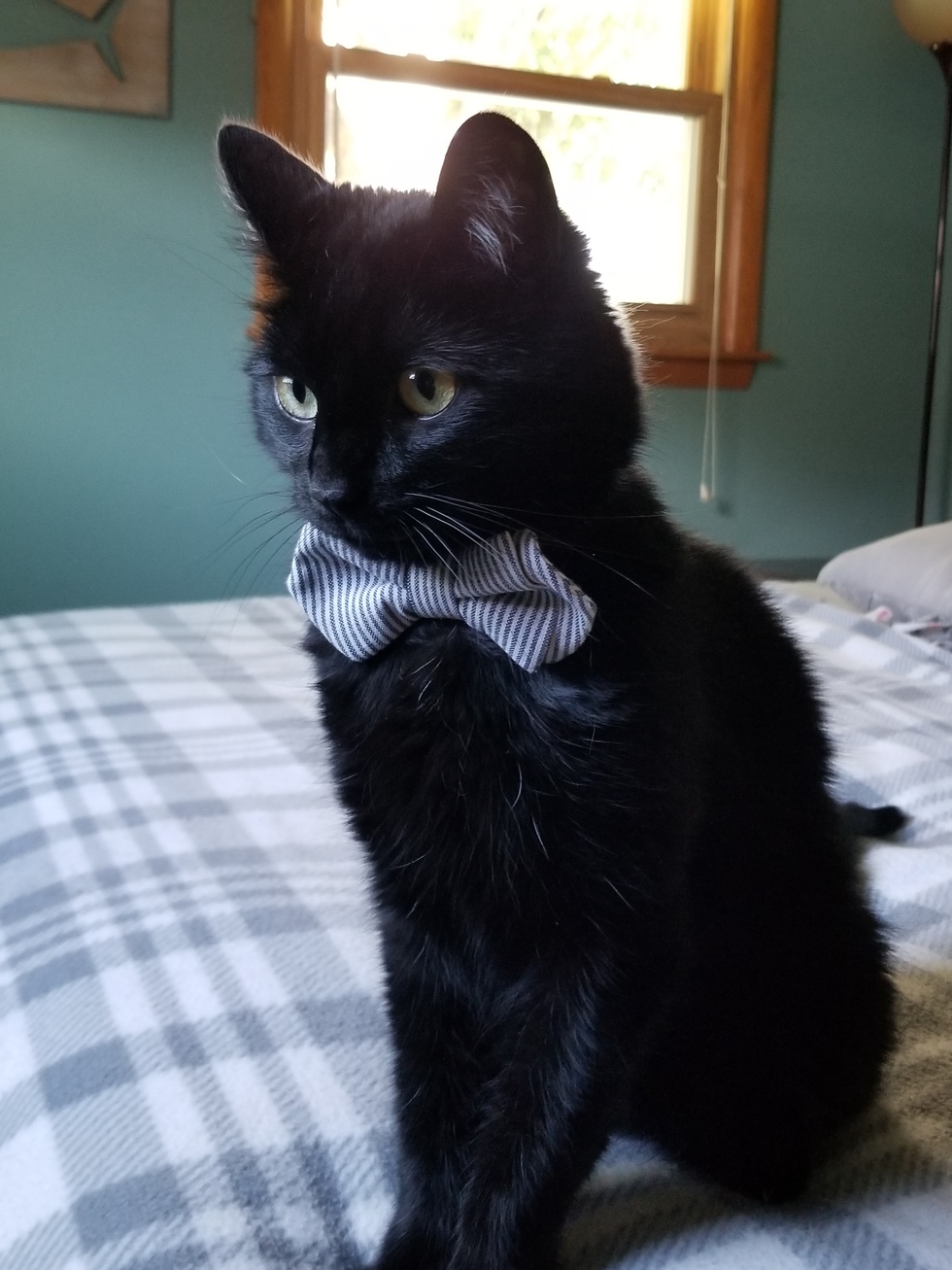The King came into my life as a birthday present 8 years ago. He has ruled his kingdom (my house) as a happy house cat, content on catching bugs and chasing that wretched laser. He's a dapper gentleman, sure to win your heart with his calm disposition and stately manner.