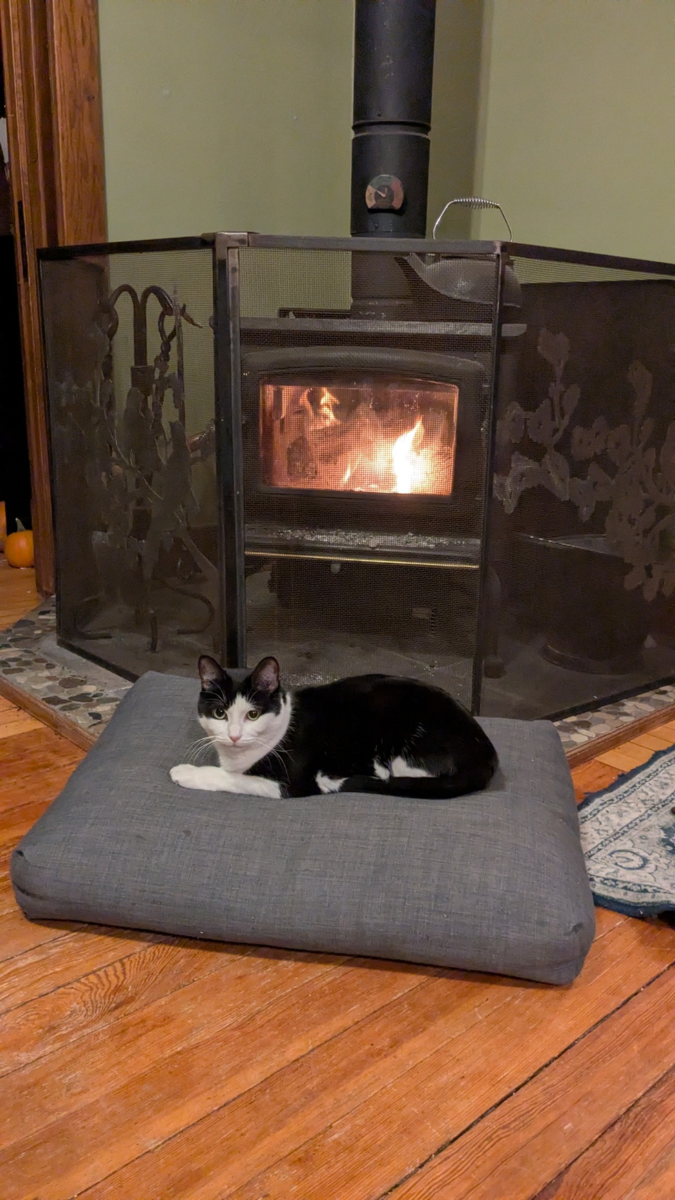 Oreo is a rescue kitty, who despite only having 3 teeth is one of the best mousers we have ever seen. Her all time record is 6 in one night. Her favorite places are gargoyle-ing on top of the refrigerator and as close to the fire as she can get