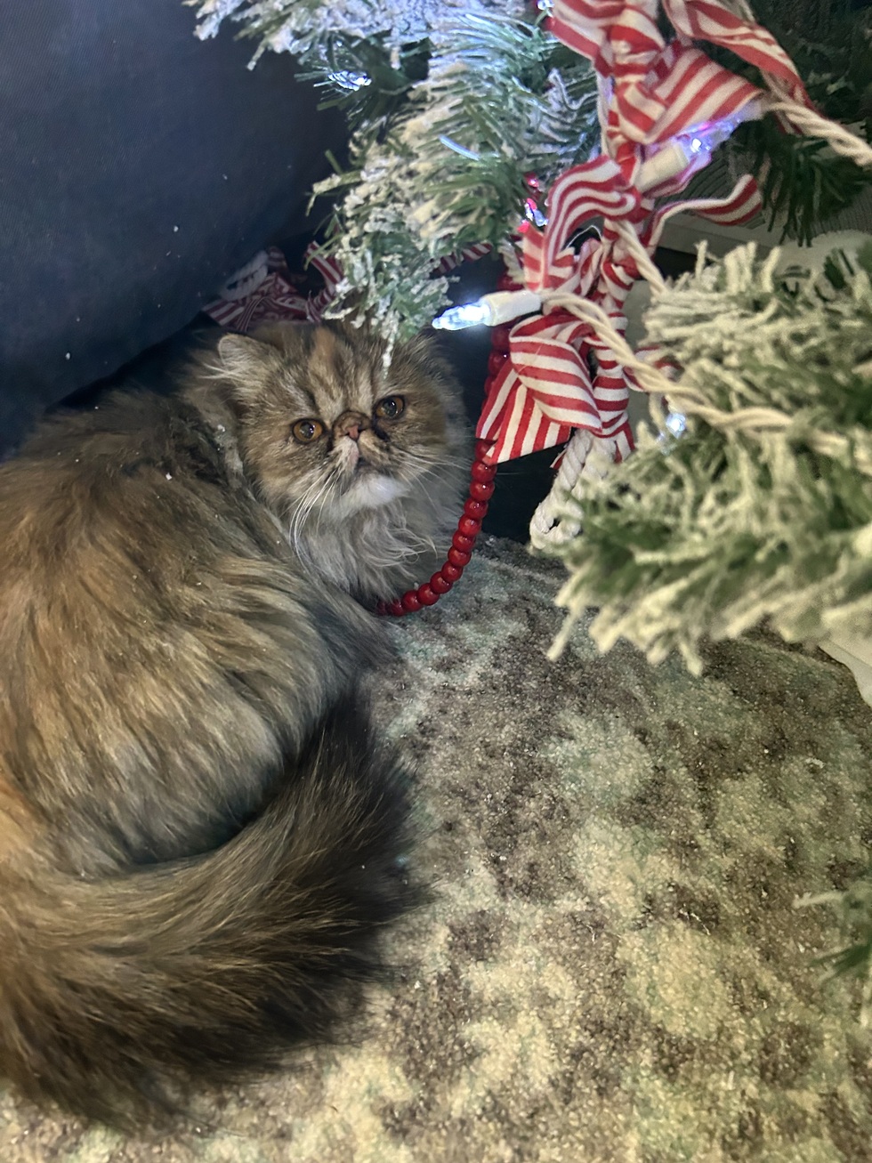 During the first storm of 2024 I had to drive to/from Milwaukee at NIGHT to pick her up! It was cold, windy, dark, sleeting and slippery! But, we made it! So that’s how she received the name. She’s a true love bug but also hangs onto her independence. She’s VERY curious about everything (notice the “snow” on her fur). Slowly one by one ornaments are disappearing and the hooks are being squirreled away for future play! Happy holidays!