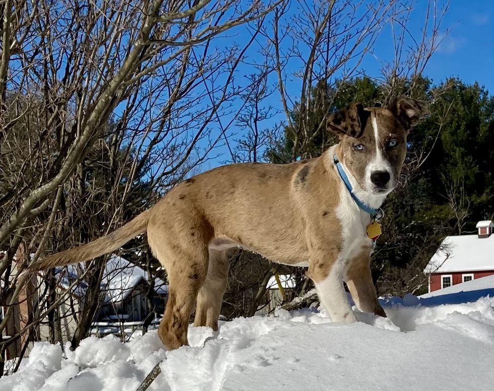 Maizie came from a high kill shelter in Louisiana as a puppy through the Ulster County SPCA.  Catahoula Leopard Dog/Greyhound(?) mix.  Friendliest, sweetest dog you could ever know!  Loves people, loves to play, and smart as a rocket scientist!  Energy to spare, and spends her days on a 23 acre farm running, playing, and being a happy dog.
