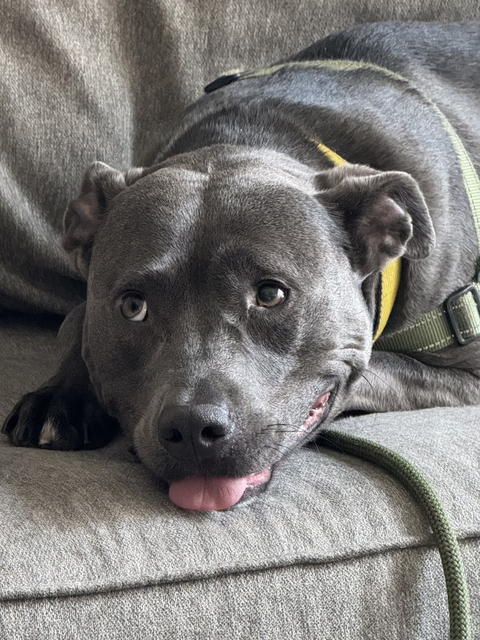 Lenny is a certified clown who we adore. He thinks he is fearsome when he growls at someone walking in the hallway or barks at a squirrel, but we know he wouldn’t be able to protect even himself if needed, let alone us. Every single person in the street is his friend, even if they don’t know about it or don’t want to be. His favorite activities include flopping on the ground for belly rubs from complete strangers and sticking his snoot deep into toys for inspection and blowing air into them creating bubbling sounds. 90% of the time he looks Iike the most abused puppy in the whole world, even though he is most definitely one of the most spoiled ones.