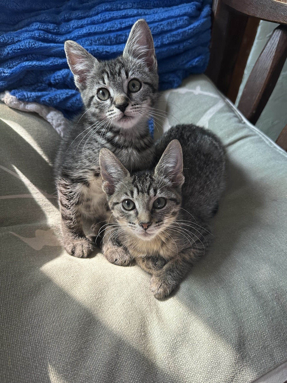 These 2 little ones were rescued from the great outdoors when they were 4 weeks old. They have been in foster care ever since. They went from terrified babies to munchkins that sleep on our heads every night. They are the sweetest and ALWAYS are found pouncing around together. Thank you for all that you all do.