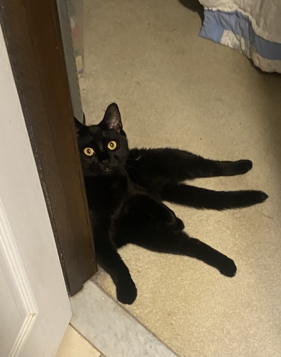 Bogie was adopted with his sister, Posy, from MWHS in May 2023. He quickly went from being a tiny little kitten to Big McLargeHuge. His favorite activities include eating, playing with his toy mice, blocking the tv, annoying his sister, trying to steal potato chips, pondering at the sink, and staring at people like this.