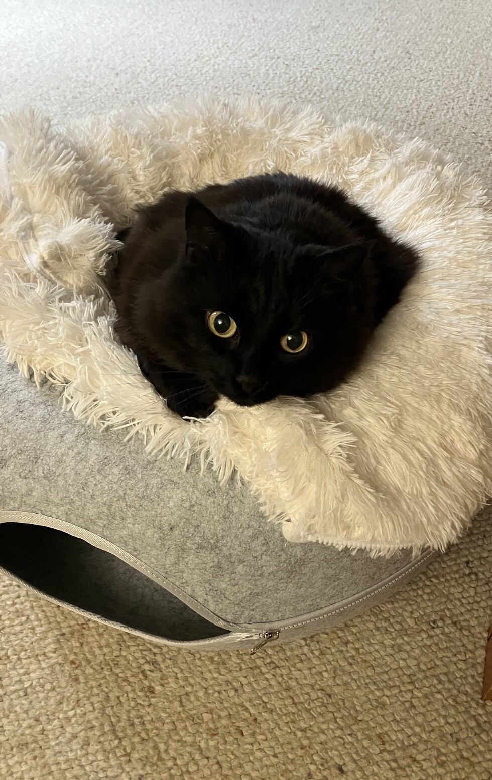 Arrie spent his first two years as the "office cat" for a vet before being put up for adoption. We fostered him for a week, and couldn't bear to see him go, so we officially adopted him. He is super-friendly and how can you resist those eyes?