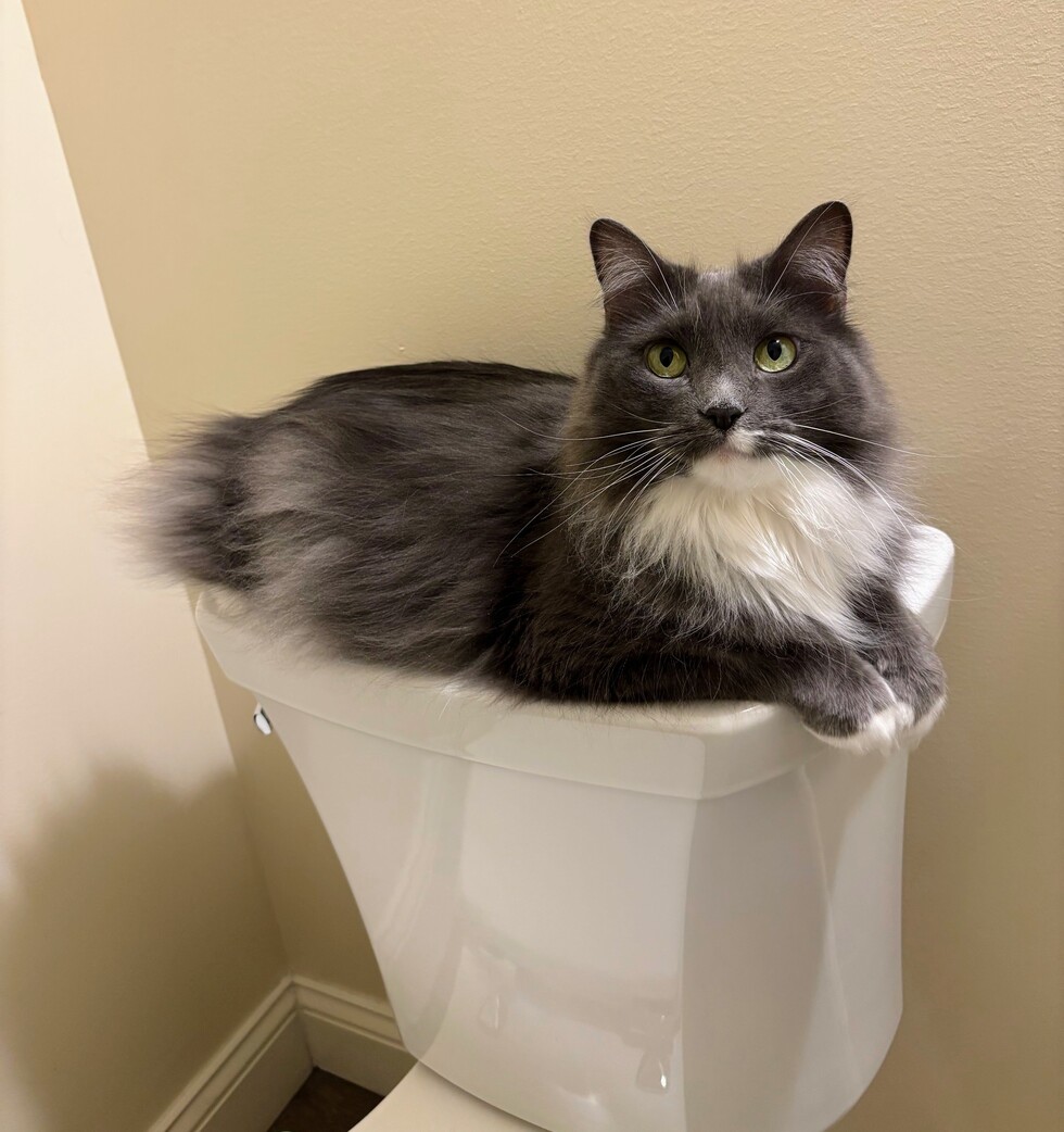 I adopted Rikki from MWHS in September 2017. She was brought to MWHS as a 2 month-old kitten in August 2017 along with her birth mom, Lucy. I was seeking a cat (or two), and I went to MWHS daily for a few days to visit these gals. I let them out of their cage (with permission of course), and Rikki, an elite athlete like her mom, kept me and Lucy amused. Fast forward to this photo. Sitting on the back of the toilet? And looking, um, beautiful? Huh. What do you think Rikki might be saying to you?