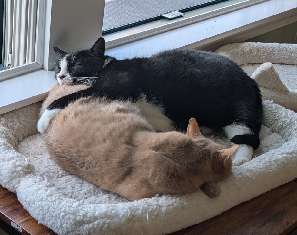 Clyde and Seamus came from a hoarding house with 60 cats! Metrowest Humane Society and other shelters helped bring these cats out and find loving homes for them all. During their time at MWHS, Clyde and Seamus bonded tightly but it took over a year for them to get to a point where they could both trust people and begin to enjoy life. It would be an understatement to say that Clyde leans on Seamus to learn what's safe, as he shows great comfort when he is able to put a paw or chin on his supportive pal Seamus.