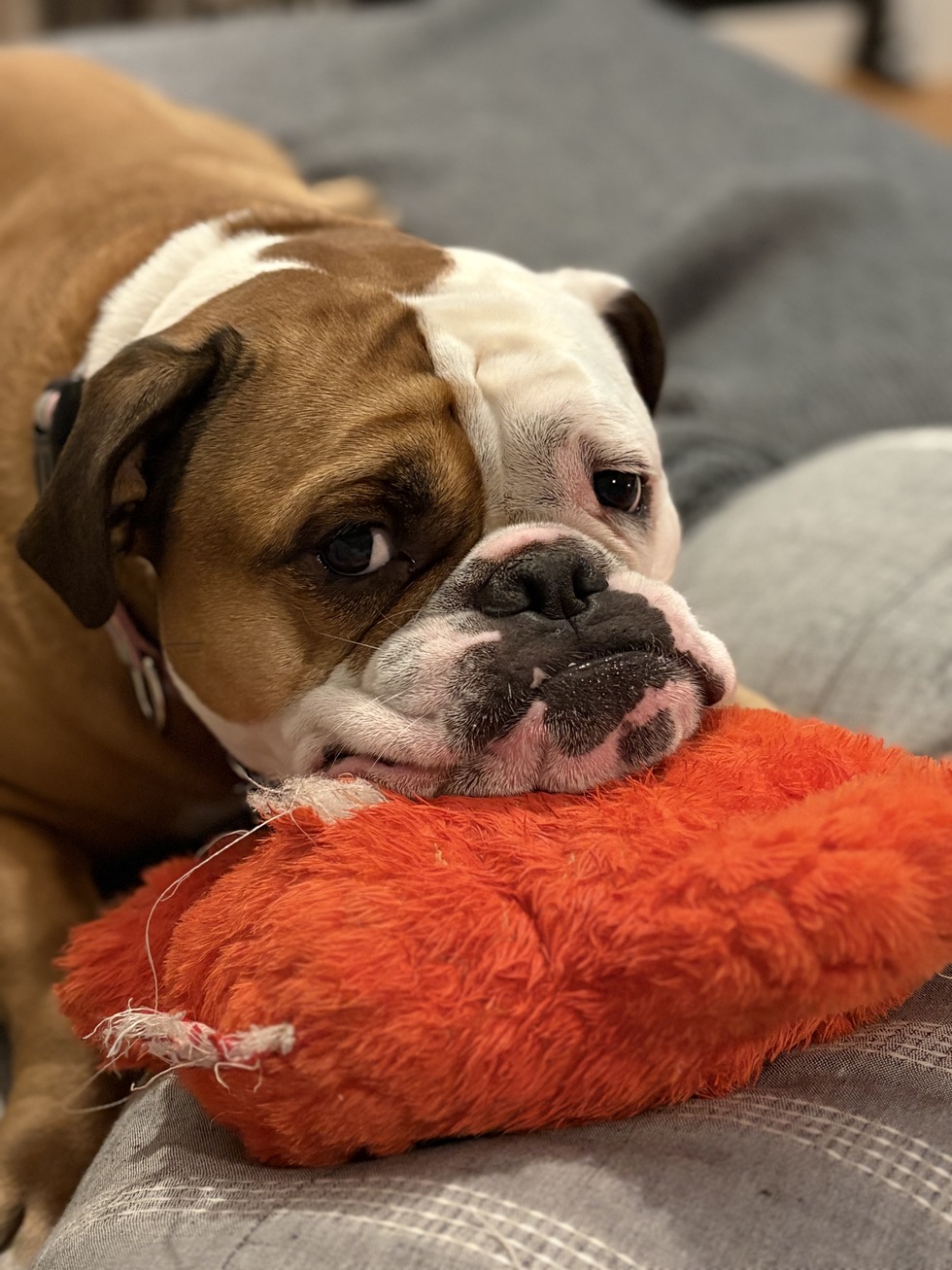 Rosie is the sweetest little English Bulldog! Rosie loves everyone and just can't be close enough to her family! When Rosie goes to work with her Dad she lights up everyone that sees her!