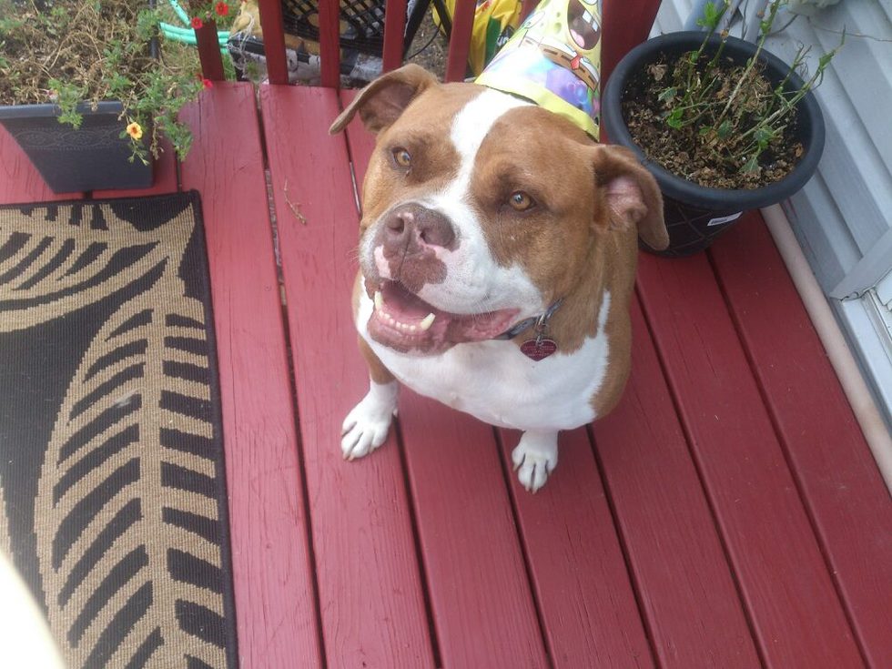 ... Red came to us after having a stretch of bad luck. Seized and taken to the Denver Animal shelter from who knows exactly what or where. Tossed from home to home and one boarding facility to the next. He came very scared, and in desperate shape, but never without a smile! His big toothy grin has come to be one of his trademarks! He is goofy and silly and sweet. He is strong but also a big scaredy cat! He loves treats, and long walks, and WATER!!! He is quite the swimmer and all around athlete! He is a big headed lunk, and a HUGE love! And he loves his squeaky toys!! But he is also a very sensitive boy, and very gentle. Especially with children. And he is SO much FUN!! He loves nothing more than a PARTY!!! (note the party hat!) It may have taken a while, but he has the life now! We didn't just save him, however, Red saved me! One night I had a terrible medical emergency and Red kept me conscious and wouldn't leave my side, even when the paramedics came!! He's my Big Red hero. He always fit into our home, right from the moment he came through the door. And I loved him immediately! He was our foster for 9 months when finally on our wedding anniversary my husband signed the adoption papers as a surprise for me! He was ours at last! Now he pibble wiggles happily all over the place!! And don't forget the belly rubs, please! He is our big, silly boy! This picture is from his adoption party / our Anniversary. Now we celebrate the day we all became a family together!