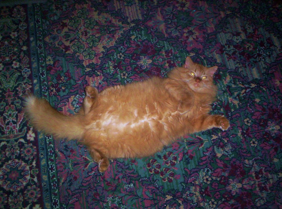 I have to thank my daughter for Poofer. She bought three kittens home and called me over. She had planned keeping all three (she believes in rescuing animals like me) but this fluffy little orange kitten came over and wouldn't leave me. The funny story is I thought Apollo (his official name) was a female and I named him Willow (Buffy fans will know why). Now, I have had cats all my life (I had over 20 cats at home at that time) so I know what to look for but I can only say he was so furry I misread the situation. :-) It wasn't until I took "her" to be spayed that I found out different. Boy, did I feel silly! He is the "typical" cat. Cuddly one minute, aloof the next. But his favorite sleeping position is splatted on my stomach with his head nuzzling my neck (makes it hard to sleep sometimes!). Obviously, he has me trained well! He brings so much joy in my life, whether he is feeling solitary, playing with his toy fish or just greeting me at the door when I come home.