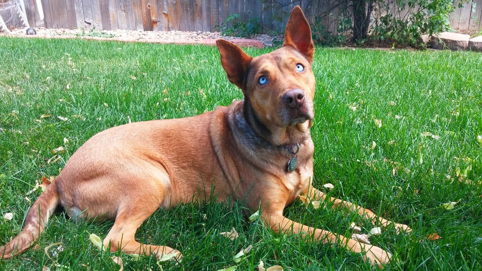 Neela, formerly "Azure", is a mixed-breed rescue dog from Animal Rescue of the Rockies. She was transported from a shelter in Texas to be with a foster family in Colorado, until I found and adopted her less than a week later. Upon seeing her gorgeous blue eyes and super sweet personality, it's not hard to see why I immediately fell in love and took her home at first sight. After I adopted Neela, it was apparent that she had a fear of men and long objects (rakes, brooms, etc). The poor thing would cower in fear and slink to a corner if a man even entered the room. She also walked and ran stiffly, as though she was not used to having the freedom to run around. After living with me and my family, she quickly saw that most humans, even men, are actually kind and caring! She now loves cuddling with all people she meets, running around our large backyard and playing with our good-natured cat.