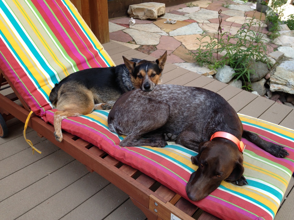 This is Shadow (AKA, Peanut Head, Bossy Pants, Knuckle Head) and her BFF Josie (GSP) chilling out after a long hike. She is an Australian Cattle Dog full of energy and love. Shadow is a fierce protector and takes her time to get to know new people. Once you are in Shadow's circle of friends she loves you to pieces and will greet you with the warmest welcome and kisses with a tongue that can reach your tonsils in a split second. Her signature move is a sneak lick attack you know you are in the circle if you get one. Shadow came from New Mexico as a puppy, she found a home but it didn't work out for her. We adopted her 4 years ago when she was 9 months old. It was a big transition for her to change families and homes when she was a puppy. She was afraid of everything new around her and it took a long time for her to feel comfortable in the world. She is the best dog in the world!