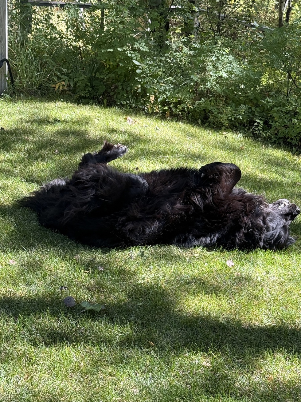 Wilson is a rescue. He came to us when he was five. He had been cared for but apparently hadn’t had much outdoor experience as he did not know how to walk on a leash or play outside. But he learned quickly and loves the woods and water around our Montana house. Now seven, he is a great gentle Newfoundland dog who loves people and other animals. This past Spring he became best friends with a young female grouse who was living in the woods. They played together and the grouse accompanied us on morning walks. He has benefited from all the activity developing the typical muscular structure of a Newfoundland. He is also a great friend to us adding to our happiness every day.  Thanks to National Newfoundland Rescue for connecting us with Wilson.