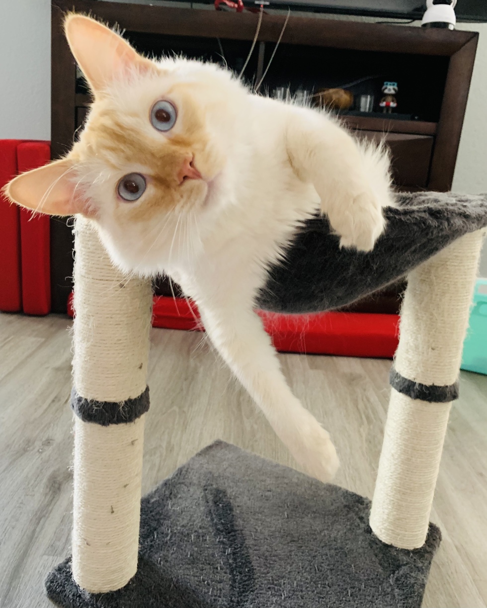 A little about me...Cash is definitely a Las Vegas jackpot winner. The minute we saw his blue eyes we fell in love With him. He just celebrated his 1st birthday on May 5th. We don’t know the exact day because he was adopted from a shelter but since he’s such a spicy boy we thought Cinco de Mayo was the perfect day. My favorite toy is a ball of tape from the lint roller which I toss around and play fetch. I love watching golf with my dad and hanging out with my family.
