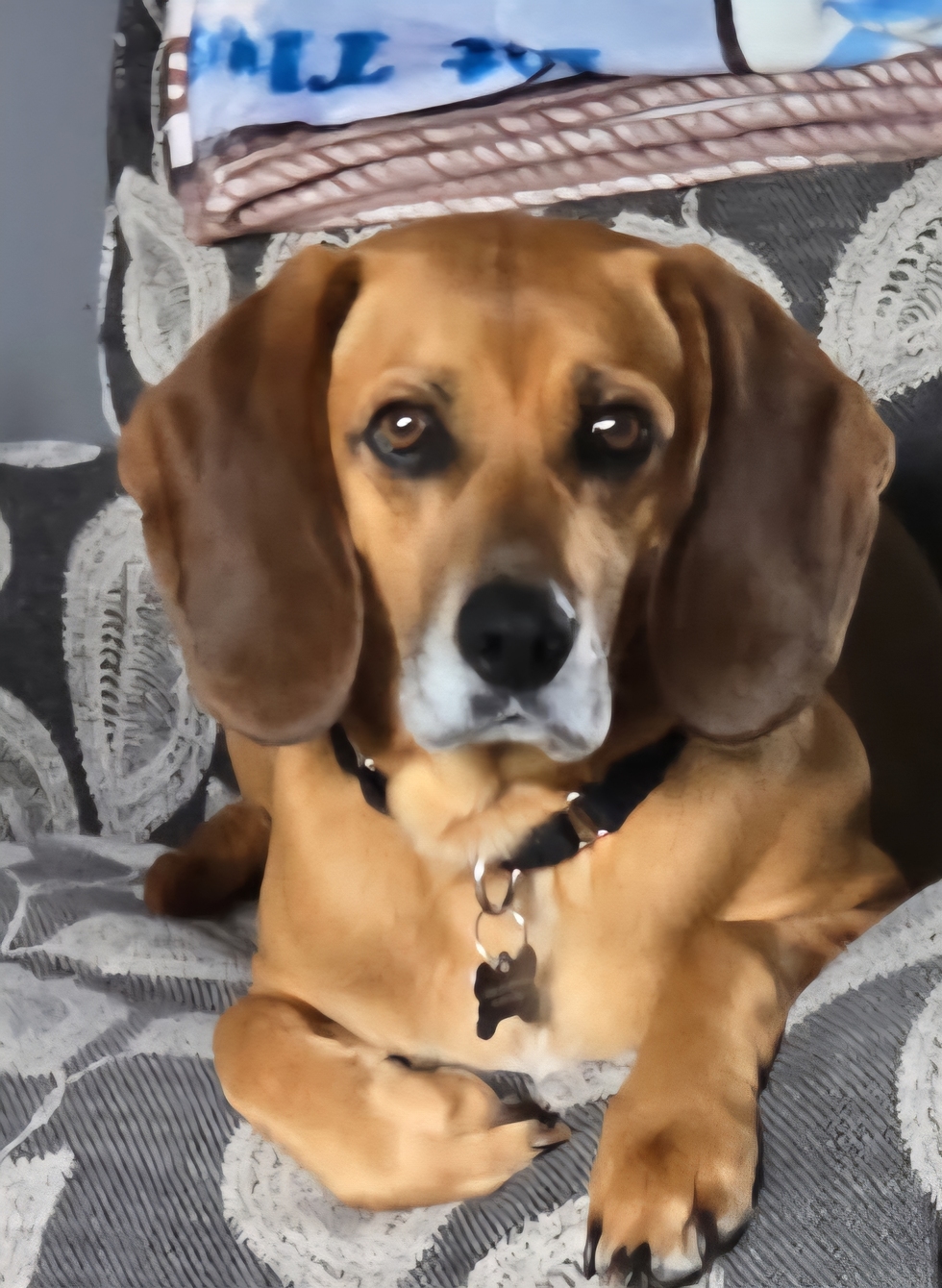 Ruger could be a poster dog for a beagle-hound mix! He is happiest when he is with his family. He loves walks, car rides, treats, his toys but most of all being snuggled. Does not like rain but Loves snow! He barks-howls when he gets excited and definitely follows his nose.