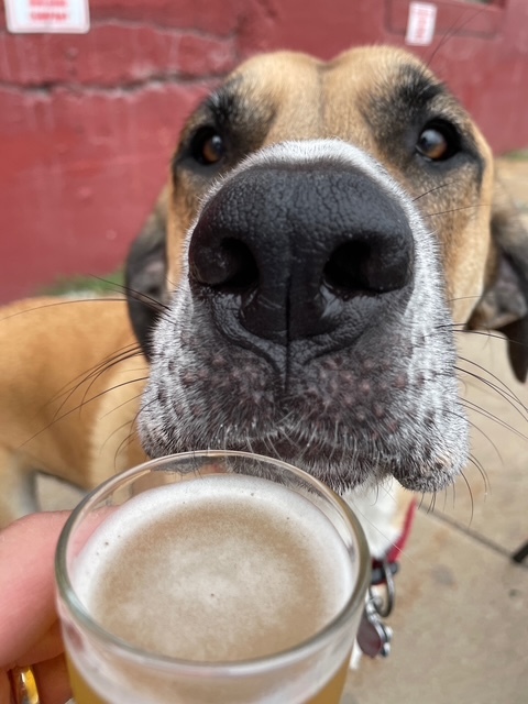Miller loves to hang out at breweries with his brother Gus. He can't resist trying to lick beer glasses, but that is only when he is not finding the most in-the-way spot to stretch out his 120 lb body so that people have to pay a belly rub tax as they go by. Miller loves everyone and his favorite is letting kids climb all over him. He is a rescue, and a classic example of the "we thought we were getting a puppy who would grow up to be 50 lbs" and it didn't quite happen that way. Love this boy!