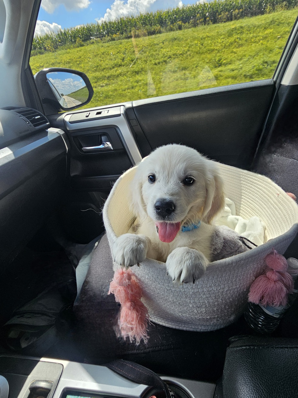 Wesson is the coolest girl because she is a carefree couch potato. She loves car rides in her basket. She's been to 4 states and travels with that golden retriever smile the whole way.