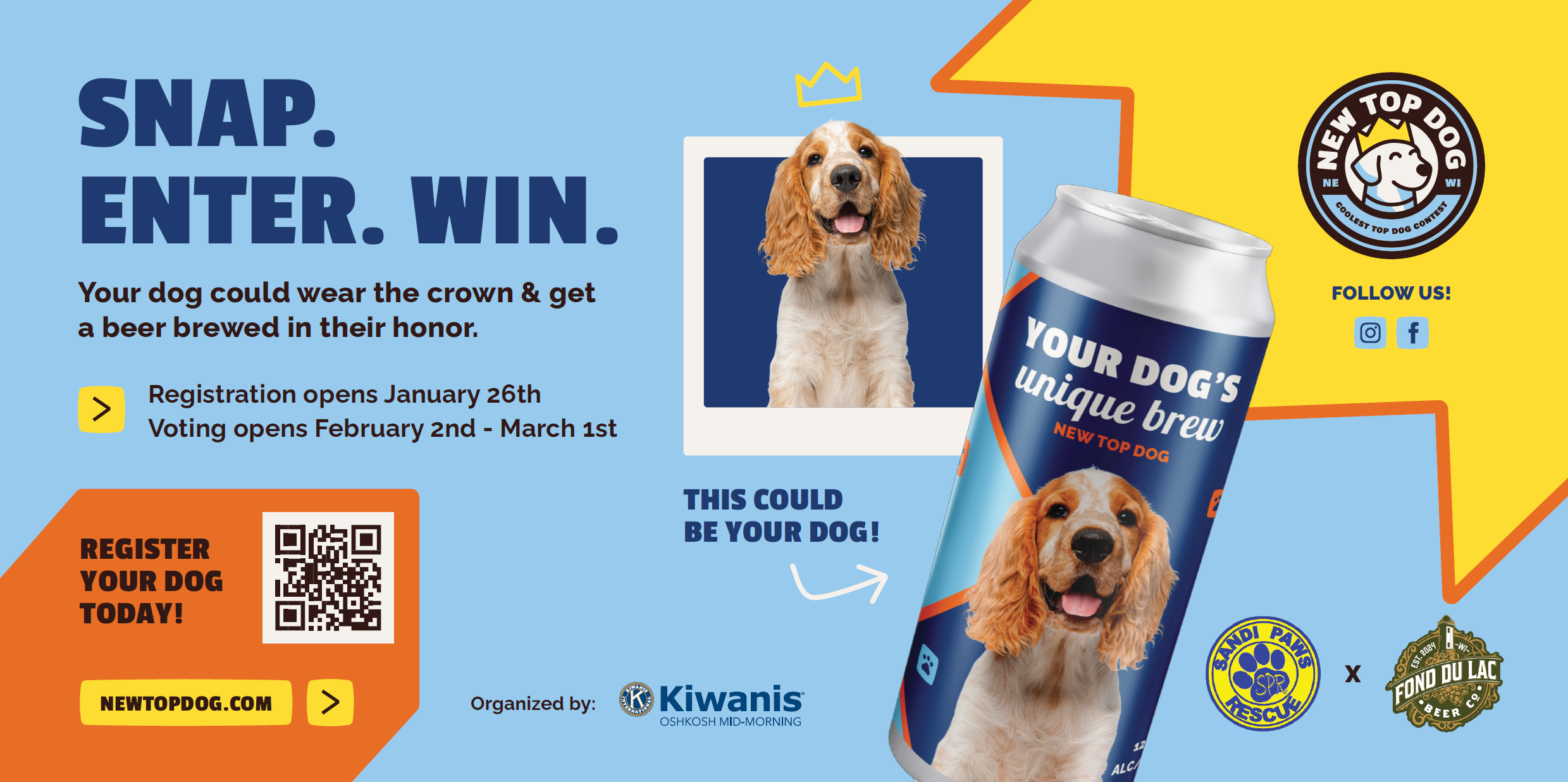 - YOUR DOG ON A BEER: The winning dog from each of the five local contests will become the face of their very own beer! They'll get to collaborate with the brewmaster and help with naming! (at the brewery's discretion) In each of the five contests, the 2nd-10th place dogs will also have their photos featured on the back of the beer can or bottle.