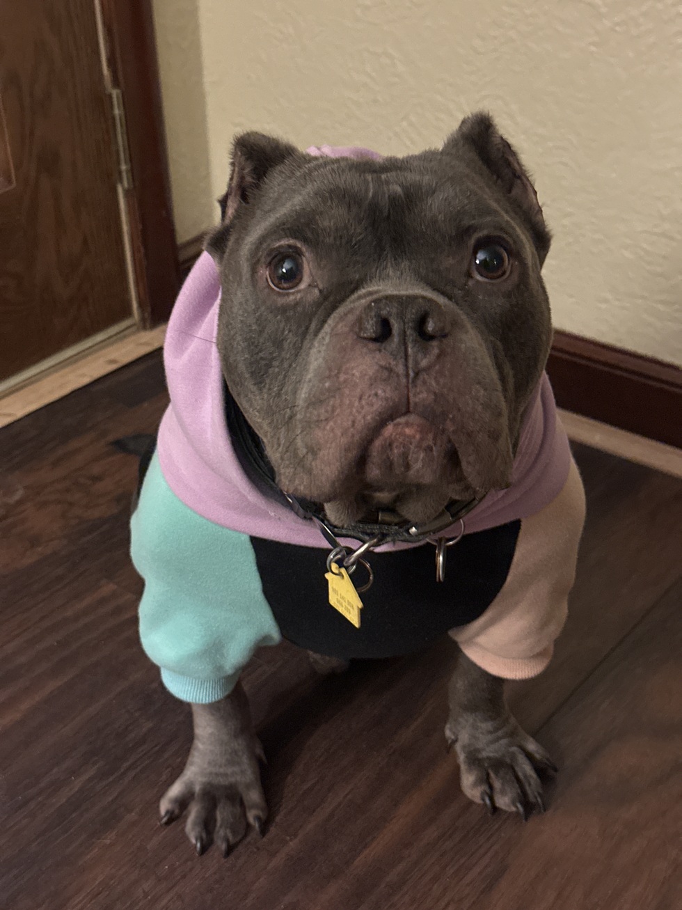 He also has an elite fashion sense. This dog loves wearing sweatshirts like he’s paying rent and about to complain about the thermostat. He knows he looks good too. No shame. No struggle. Just vibes. If cozy were a lifestyle brand, he’d be the face of it.