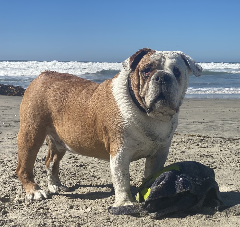 These days I’m busy showing off my summer beach bod on road trips with Mom and Dad, practicing my stand-up paddle boarding skills (I’m basically a pro), splashing around in the local pond for some water aerobics, soaking up the sun, turning into a snow bulldozer in winter, and then snuggling on the couch or sprawling across my king-sized bed. Treats are plentiful, belly rubs are now very acceptable, and I get to be the goofy, loving bulldog I was always meant to be.