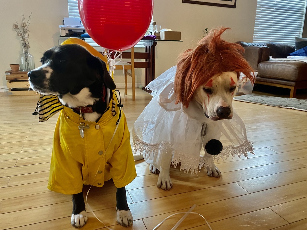 Panda Bear and Emma were scheduled to be euthanized at the humane society in South Carolina. Paws4You Rescue in Miami received them before it could happen and they were immediately transported to Miami were I adopted them. The picture is of the first Halloween together depicting the characters in the movie IT