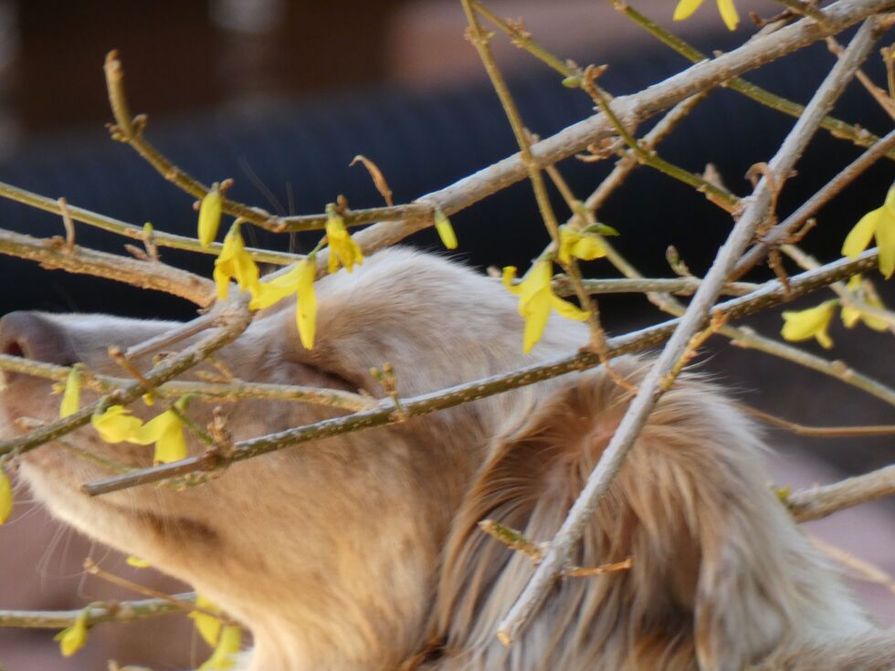 Brought Kira home from NMDR in early April 2023. She was a little intimidated by the outdoors, but she found a place under the forsythia bush that was just starting to blossom. The look on her face in this photo seemed to be almost a huge sigh of relief at her new situation - She could close her eyes exhale - finally. Although she was 3 years old, it was for sure the Spring of her new life!