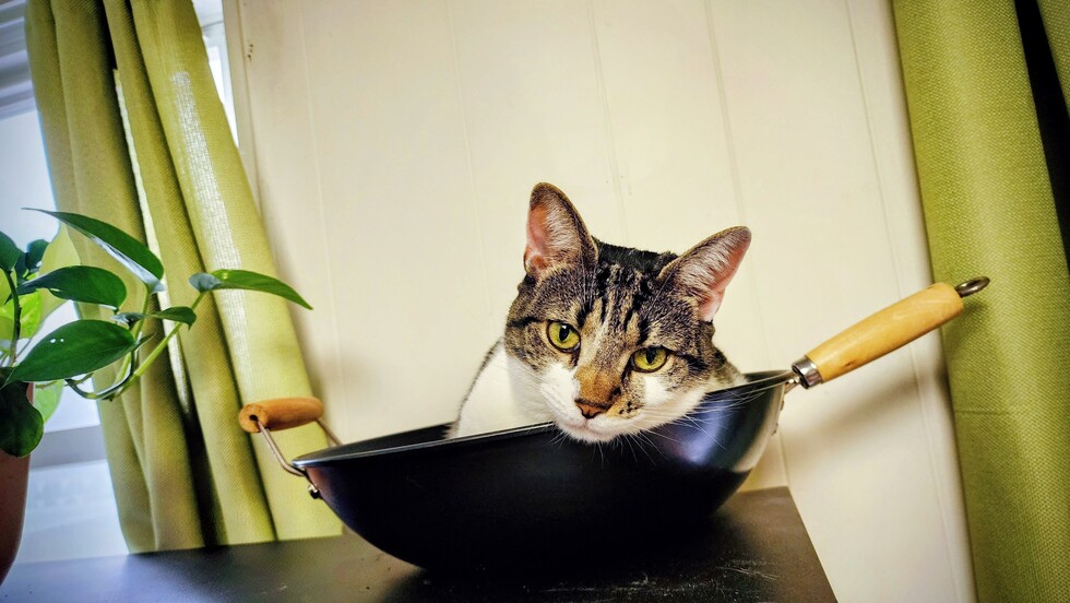 We put the wok on top of the fridge and Willow claimed it as her new bed. She loves sleeping inside it and we had to buy another one, that we keep away from her, jijiji. She has plenty of beds, but what is more comfortable that a wok?