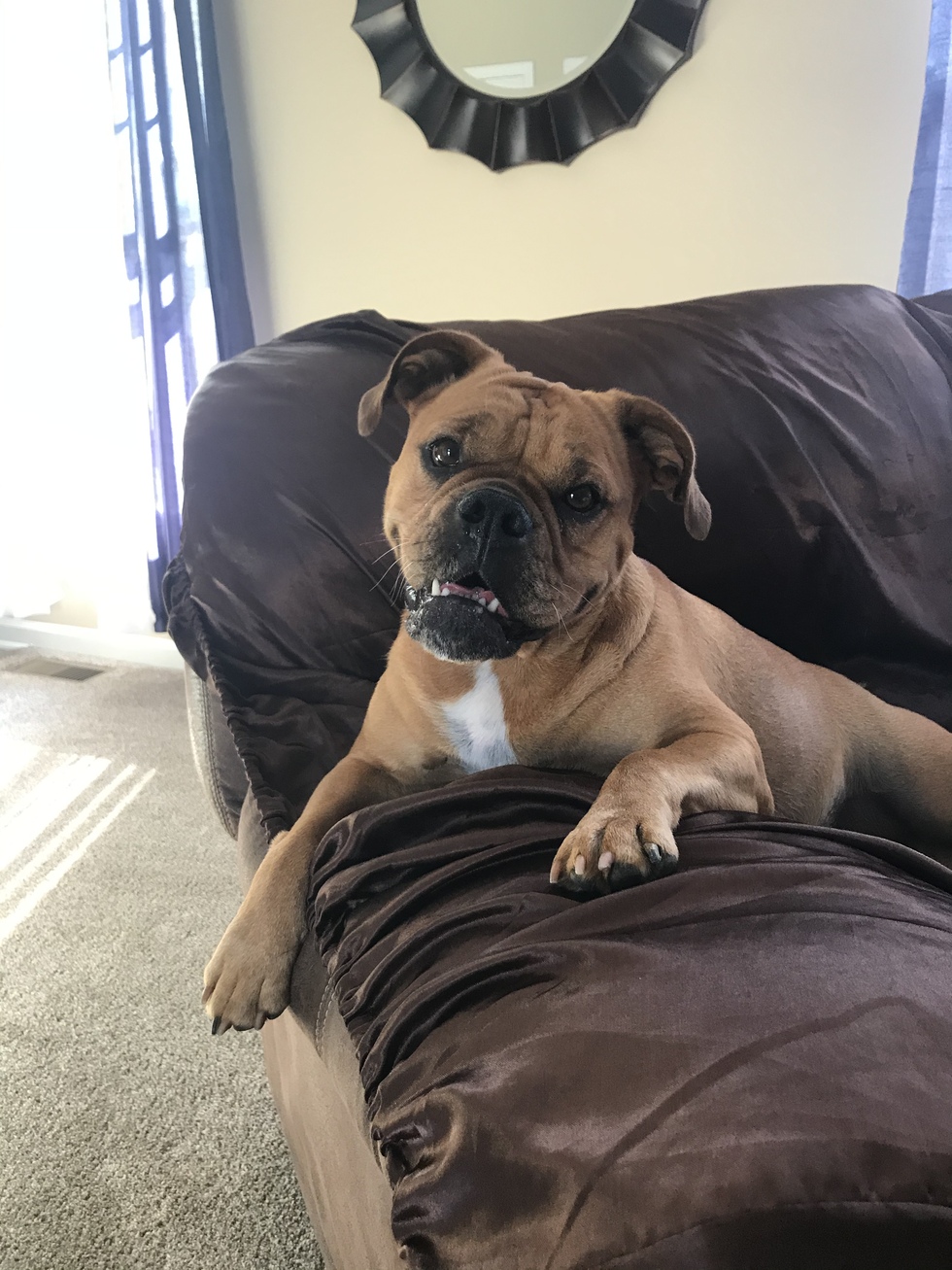 This is Bella. She is an Olde English Bulldog, Beagle and Pug mix. She loves walks, treats and sleeping lol. When doing none of those she likes to play with her brother Jaxson. The two of them are inseparable.